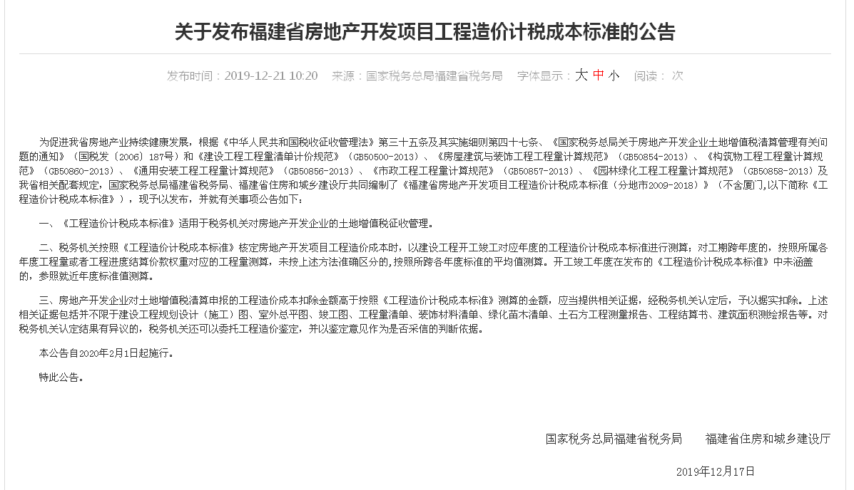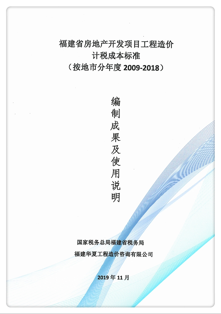 我公司受福建省税务局委托,编制“福建省房地产开发项目工程造价综合标准(按地市分年度<2009-2018>)”于2019年12月17日由国家税务总局福建省税务局、福建省住房和城乡建设厅联合发布。