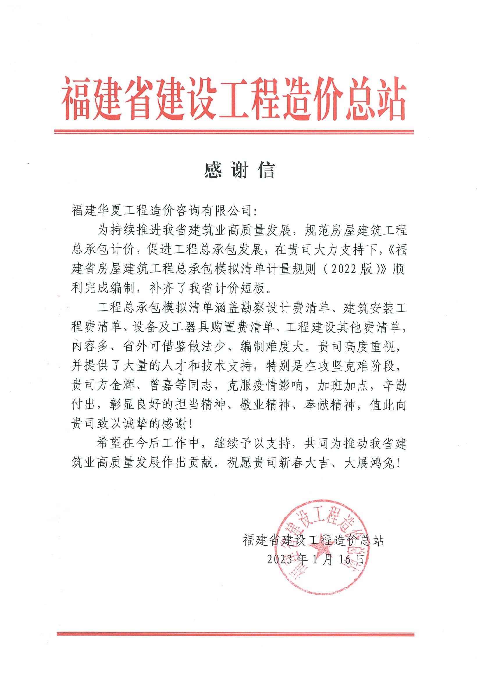 信中感谢我司高度重视,为《福建省房屋建筑工程总承包模拟清单计量规则(2022版)》编制的完成提供了大量的人才和技术支持。尤其感谢我司方金辉、曾嘉等同志,在攻坚克难阶段克服疫情影响,辛勤付出,彰显了良好的担当精神和敬业精神。
